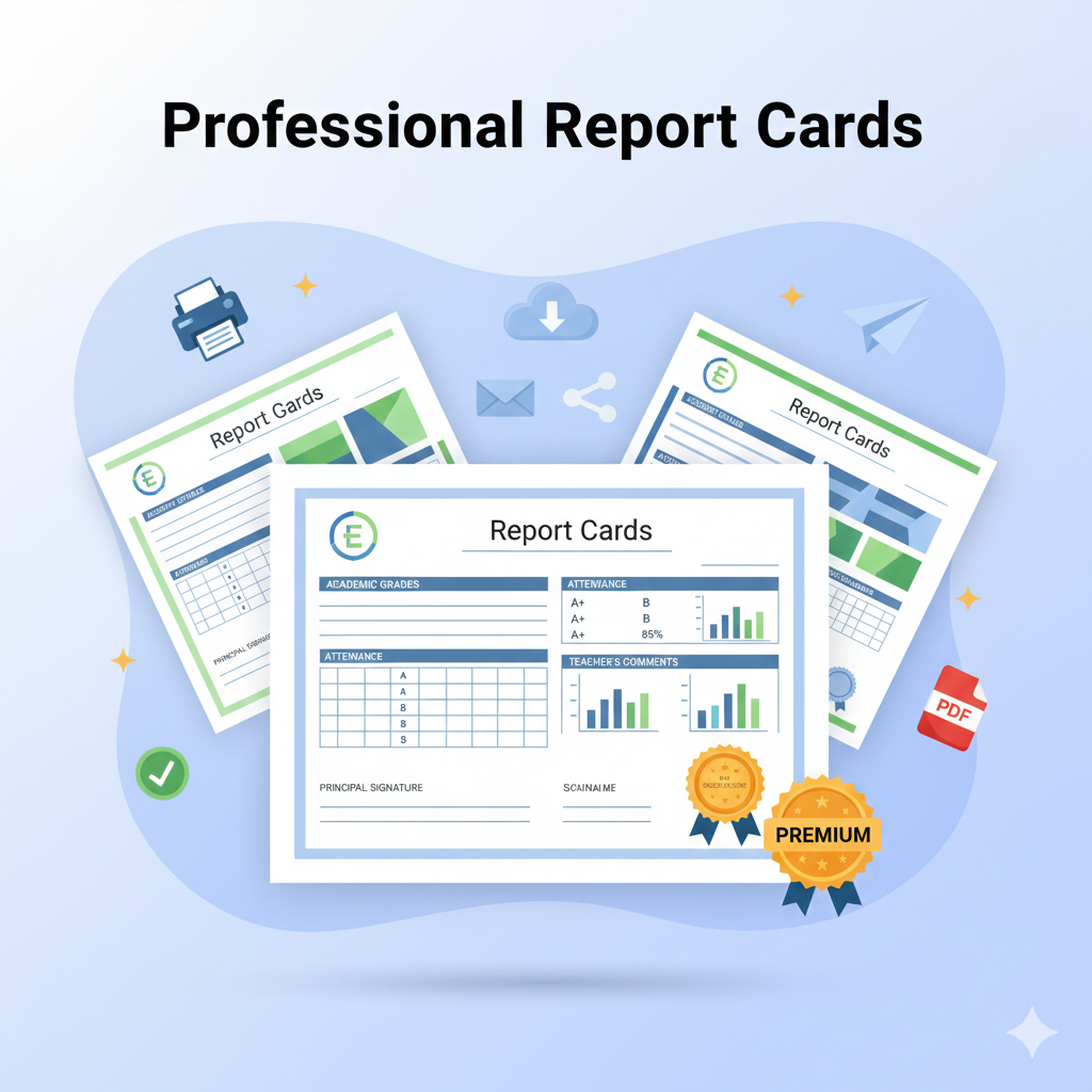 With one click, create beautifully formatted, customized report cards with your school's branding, logos.